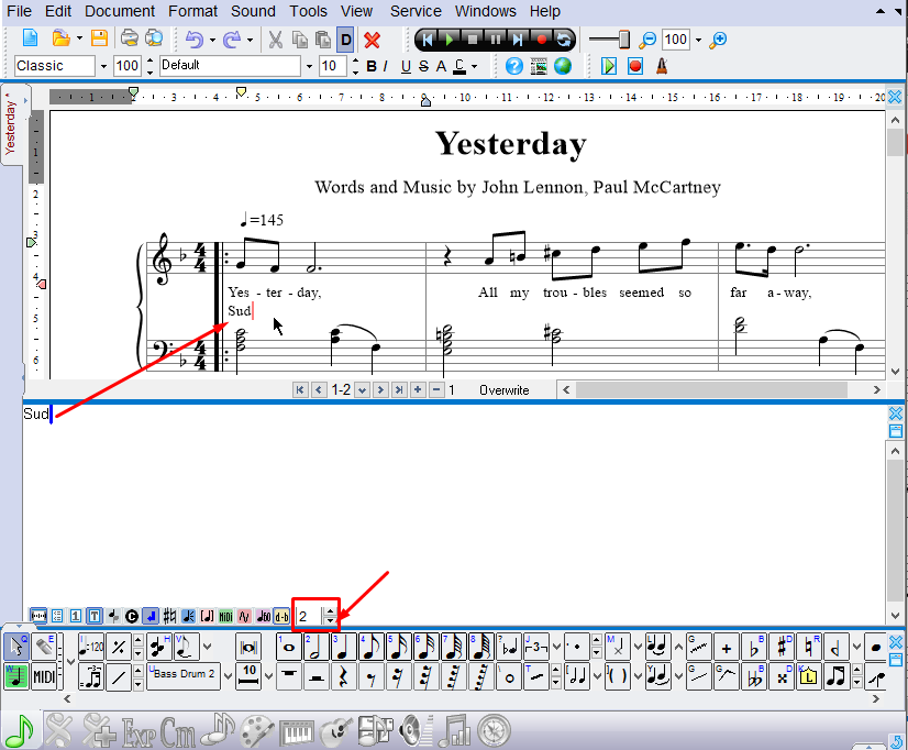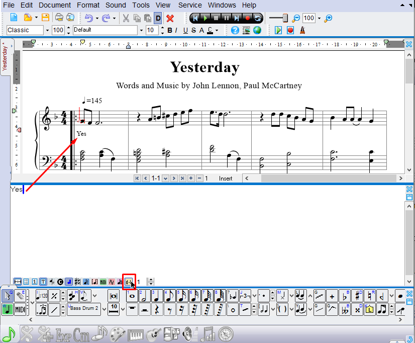 You can use special buttons on the Notes and Design toolbars, or use a special editor to enter lyrics. Below we describe several ways to do this.
